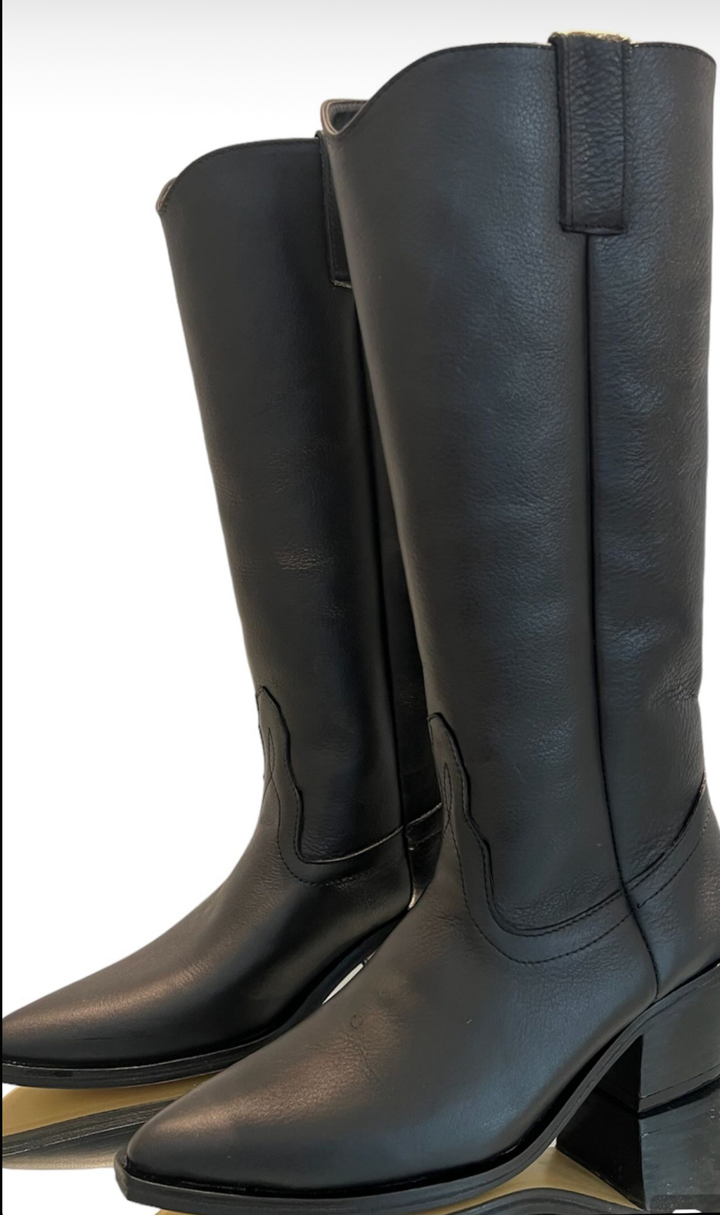 Botas de cuero negro, con un pico en v adelante, taco 5 cm . Caña 36 cm .