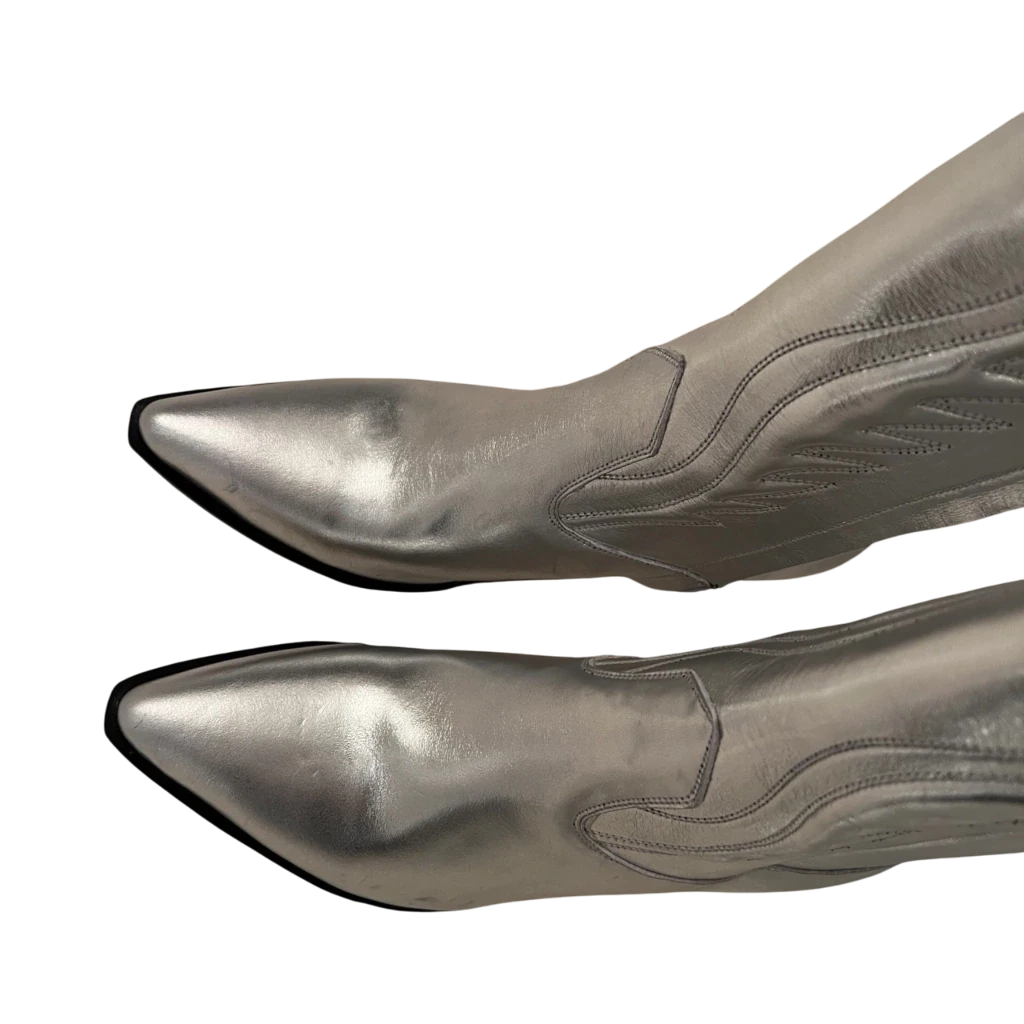 Botas de cuero silver de 26 cm de caña con cierre interno, taco forrado de 8 cm.