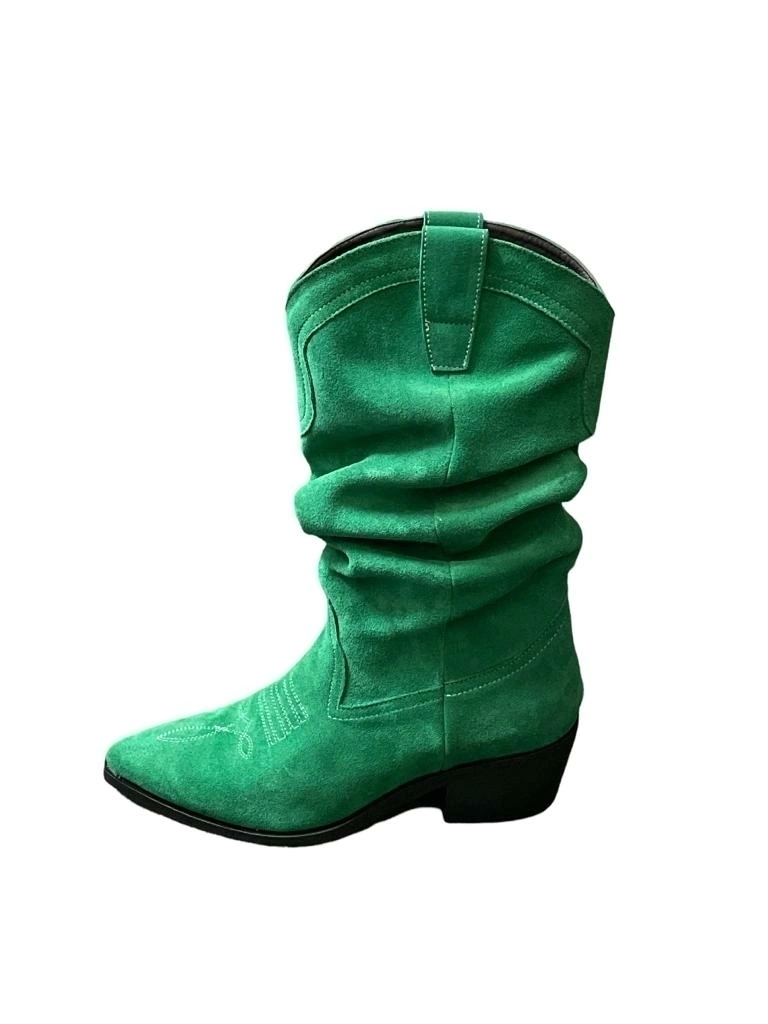 Botas de gamuza verde esmeralda, 28 cm de caña medir desde el talon. 5 cm de taco . la entrega es anlos 5 dias. por transferencia descuento..