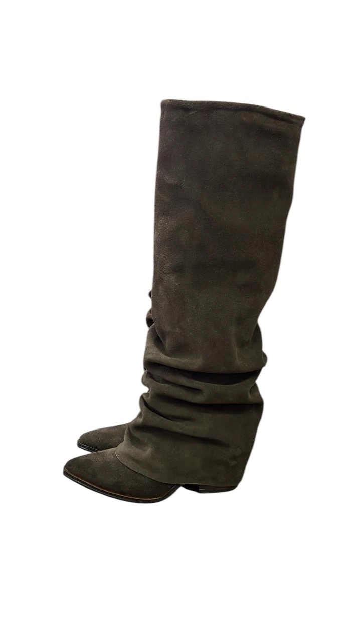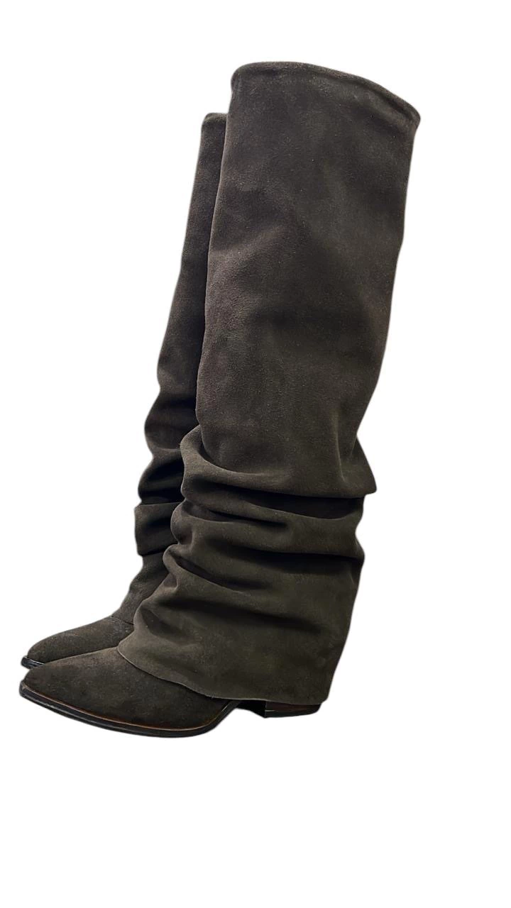 Botas de gamuza brown , forradas en cuero, taco de 8 cm, recubierta con gamuza marrón.