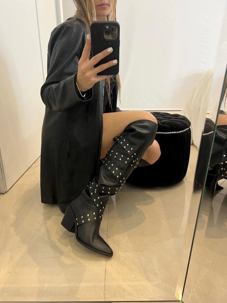 Botas de cuero de 50 cm de caña y taco de 8 cm, con cinturones de cuero con tachas niqueladas unidos a la bota y pasados en la parte de atrás por dos presillas ,